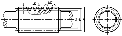 蝸杆一般選用一個視圖,其齒頂線、齒根線和分度線的畫法與圓柱齒輪相同,如下圖所示。圖中以細實(shí)線表示的齒(chǐ)根線也可省略。齒(chǐ)形可用局部剖視或局部放大圖表示。