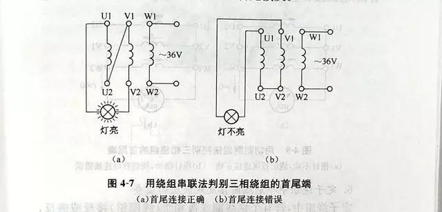 先用萬用表将繞組的6根引線分成3個獨立繞組,然後按圖4-7所示的接法通以低壓交流電(diàn)源(所加電(diàn)壓應使繞組中的電(diàn)流不超過額定值)。如果燈(dēng)泡發亮,則說明串聯的U、V兩相繞組是正向串聯。即一相繞組的首端接另一相繞組的尾端,如圖4-7(a)所示。如果燈(dēng)泡不亮,則說明是反向串聯,如圖4-7(b)所示。這時,可将一相繞組的首尾端對調再試。判斷出前兩相的首尾端後,将其中一相再與第三相串聯,用同樣方法實驗。最後,可以判斷出三相繞組各自的首尾端。
