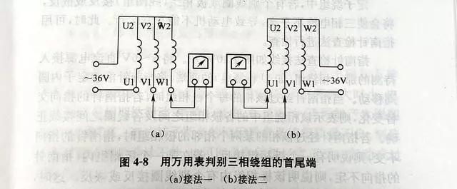 将三相繞組接成星形,從一相繞組接入36V交流電源,在另外兩相繞組的一端接入置於(yú)10V交流電壓擋的萬用表,按圖4-8(a)和(b)所示各接一次。 通電後,觀察萬用表指針的擺動情況。若兩次萬用表指針均不動,則說明圖中所示的首尾端正確(què);若兩次萬用表指針都偏轉,則說明兩次均未接電源的那一相的首尾接反 ;若隻有一次指針偏轉,另一次指針不動,則說明指針不動的那一次中接電源的那一相首尾接反。