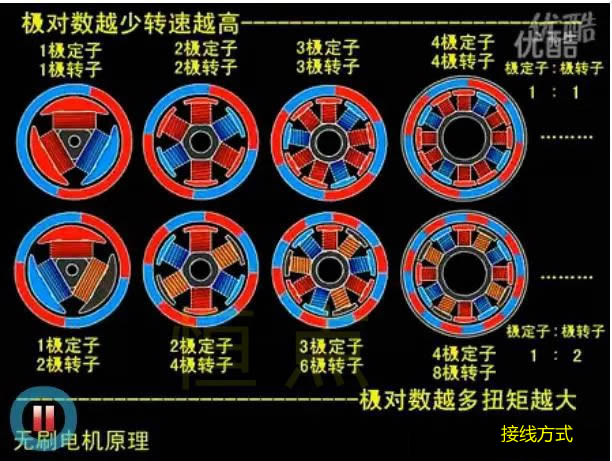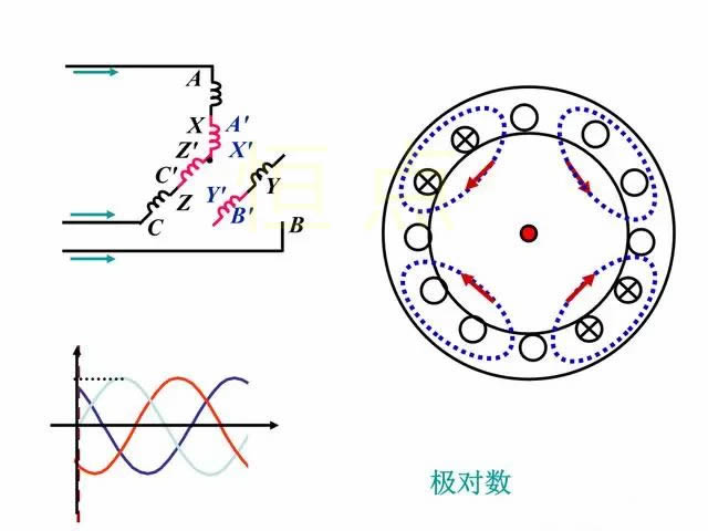 三相交流電機每組線圈都會産(chǎn)生N、S磁極,每個電機每相含有的磁極個數就是極數 。由於(yú)磁極是成對出現的,所以電機有2、4、6、8……極之分。