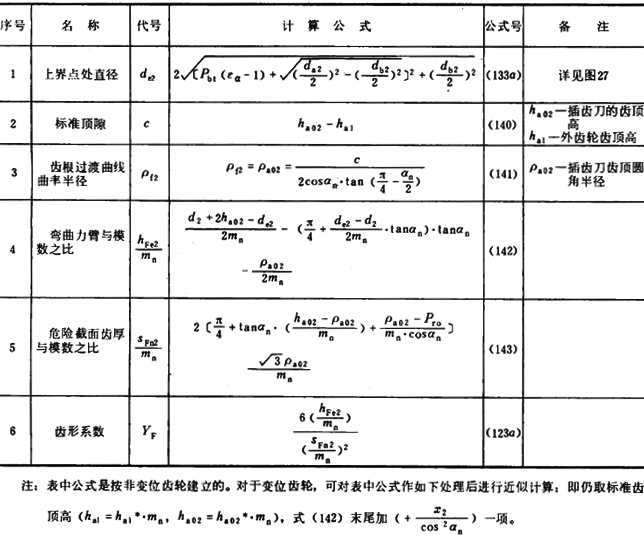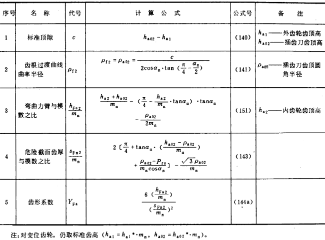 内齒輪的齒形系數YF不僅與齒數和變位系數有關,且與插齒刀的參數有關。爲瞭簡化計算 ,可近似按替代齒條計算(見圖27)。替代齒條的法向齒廓與基本齒條相假,齒高與内齒輪相同 ,法向載荷作用角αFen等於αn,並以腳标2表示内齒輪 。有關計算公式見表16(适用於Z2>70)。