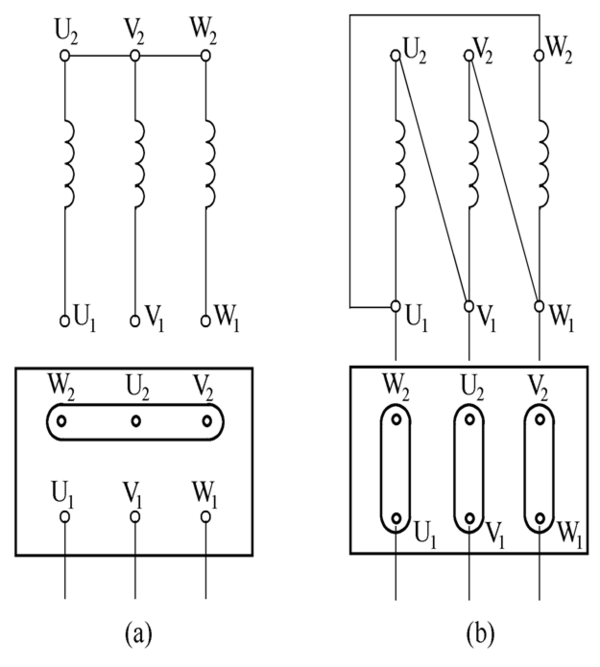 三相繞組由三個彼此獨立的繞組組成,且每個繞組又由若幹線圈連接而成 。每個繞組即爲一相 ,每個繞組在空間相差120°電角度。線圈由絕緣銅導線或絕緣鋁導線繞制。中 、小型三相電動機多採用圓漆包線,大、中型三相電動機的定子線圈則用較大截面的絕緣扁銅線或扁鋁線繞制後,再按一定規律嵌入定子鐵心槽内。定子三相繞組的六個出線端都引至接線盒上,首端分别标爲U1, V1, W1 ,末端分别标爲U2, V2, W2 。這六個出線端在接線盒裏的排列如圖所示,可以接成星形或三角形。