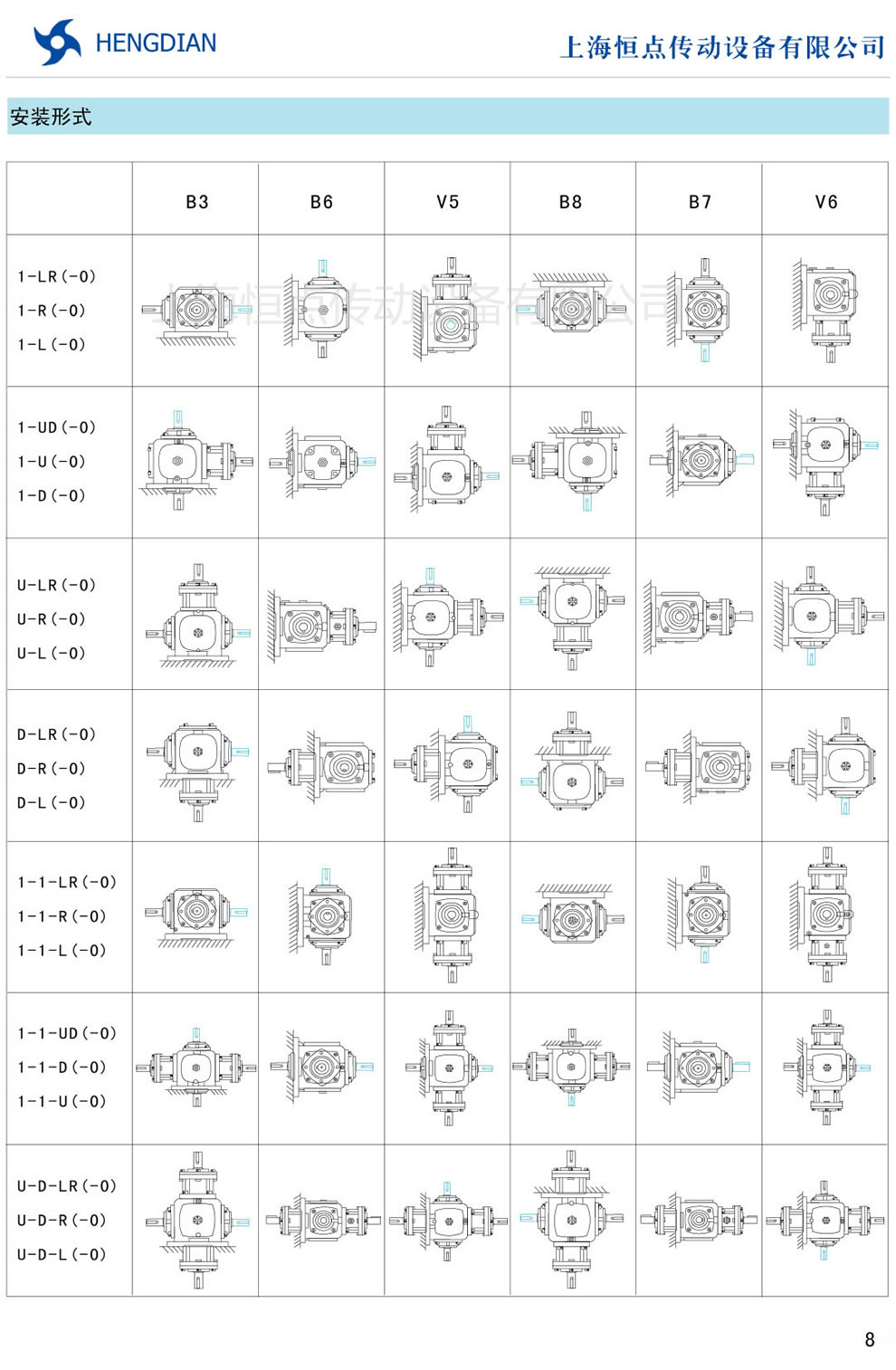轉向箱安裝形式,有B3,B6,V5,V8,B7,V6.常見的是B3.訂單時,如果不特殊說明,一般按B3安裝方式來組裝轉向箱.