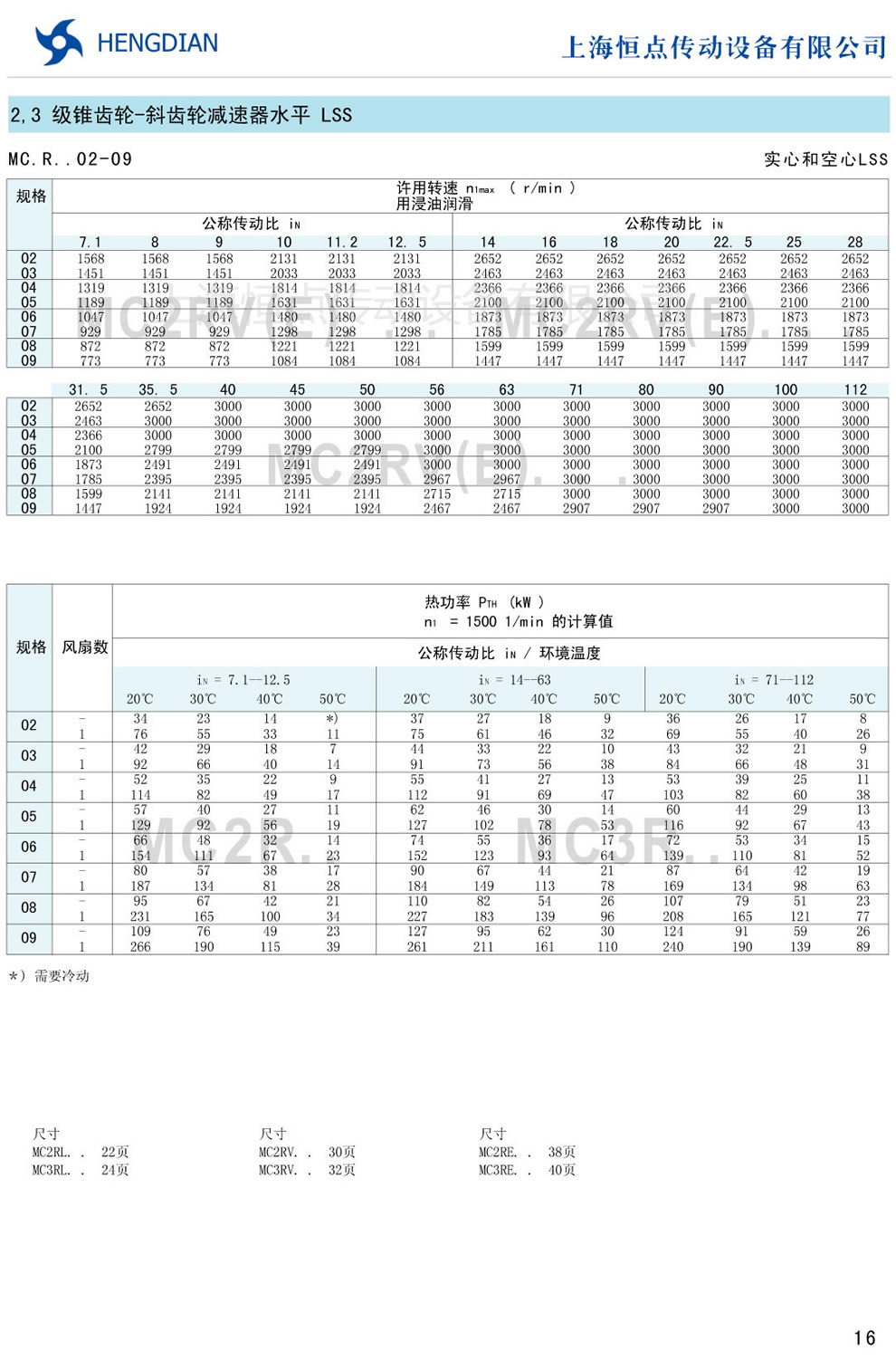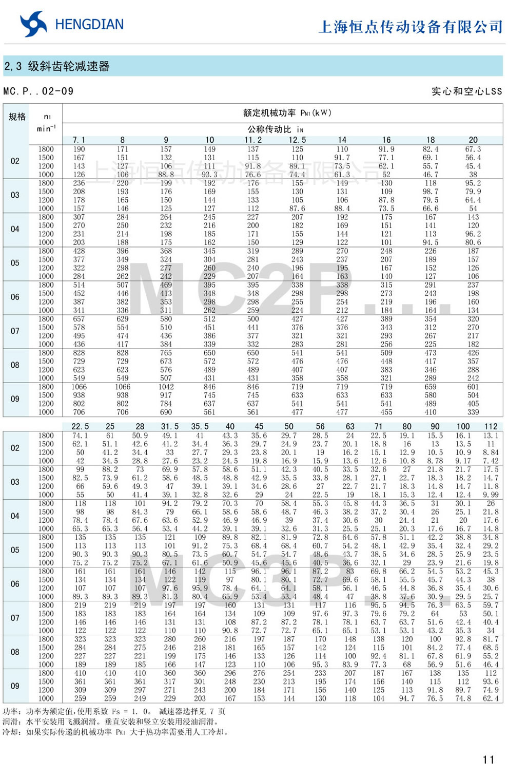 傳動能力表 - MC硬齒面減速器