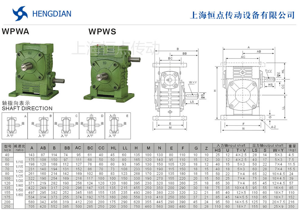 WPWA與WPWS系列萬能型蝸輪蝸杆減速機選型指南,WPWA與WPWS減速機軸輸入,軸輸出.WPWA與WPWS減速機的外形尺寸及安裝尺寸WPWA與WPWS減速機軸指向表示方法.機座号40到250,速比10到60.