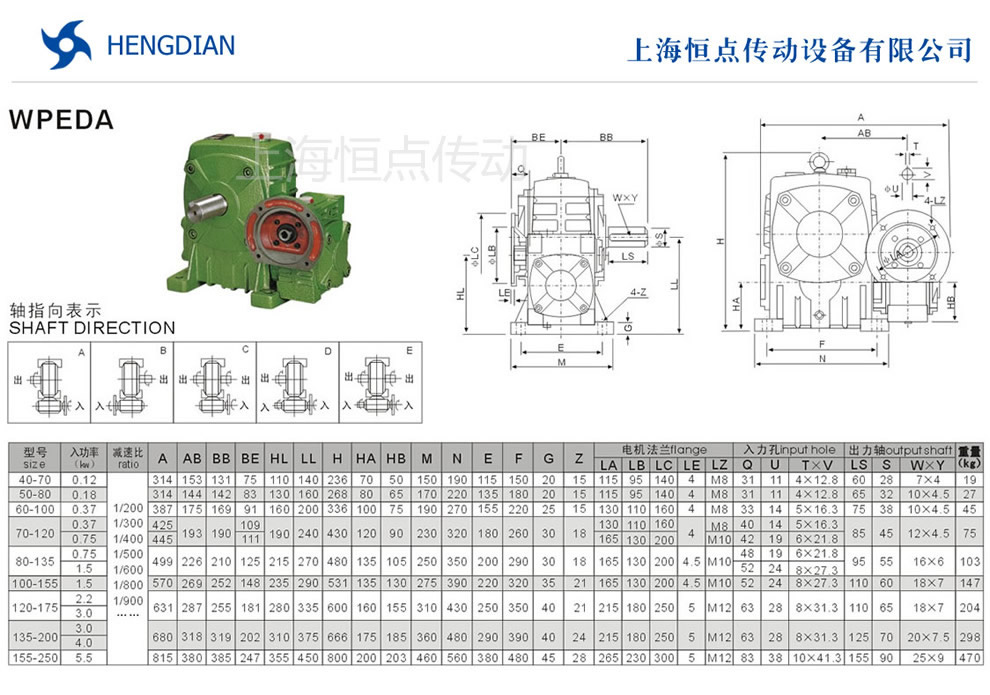 WPEDA雙級蝸輪蝸杆減速機選型指南,WPEDA雙級減速機的外形安裝尺寸.WPEDA雙級減速機法蘭輸入,軸輸出.WPWPEDAEA雙級減速機軸指向表示方法.機座号40-70到155-250,速比200到900.