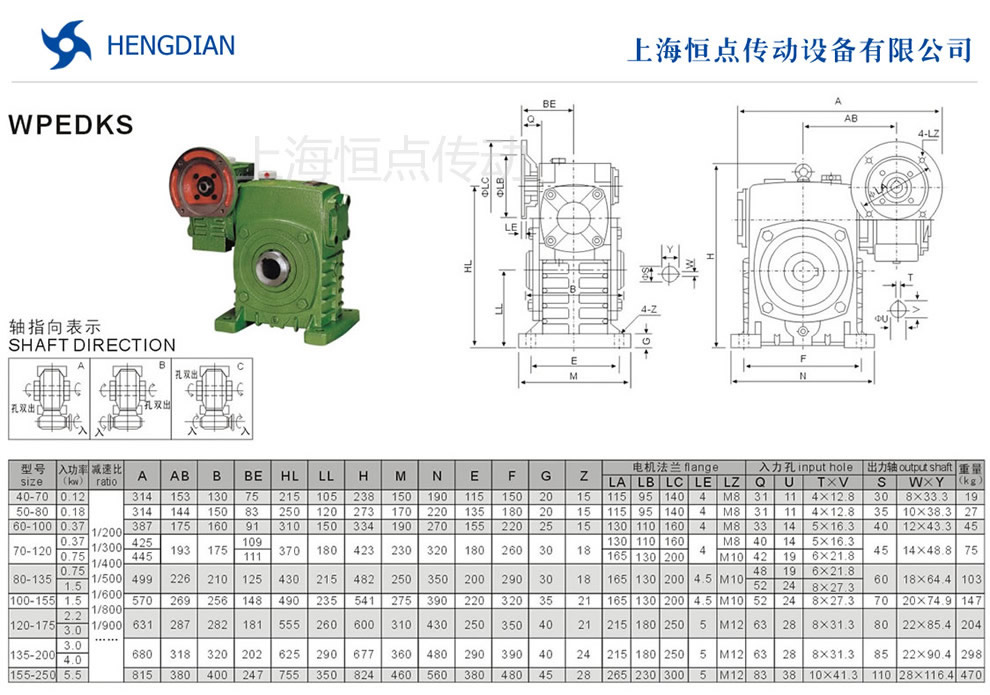 WPEDKS雙級減速機的外形安裝尺寸.WPEDKS雙級蝸輪蝸杆減速機選型指南,WPEDKS雙級減速機法蘭輸入,孔輸出.機座号40-70到155-250,速比200到900.