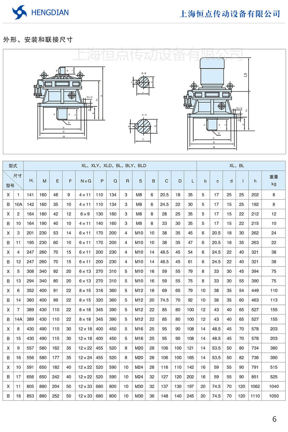 單級立式擺線減速機外形,安裝和聯接尺寸 - X/B系列擺線針輪減速機